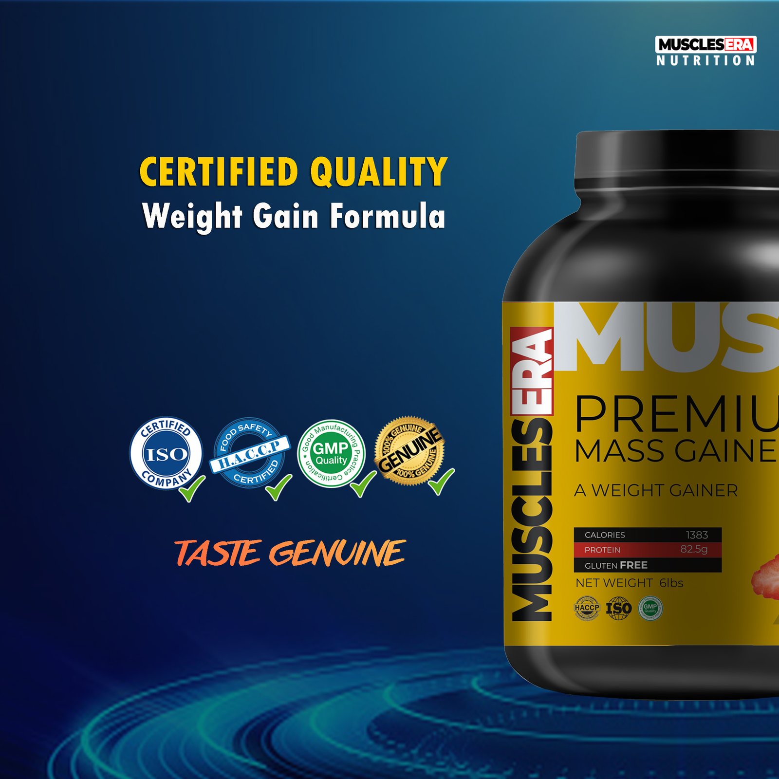 MUSCLES ERA PREMIUM MASS GAINER – This is a high quality Weight Gainer that Is loaded with complex carbs:Protein in 3:1 ratio along with BCAAs, Calories and other nutrient to help you achieve your daily goals in lean mass gaining.